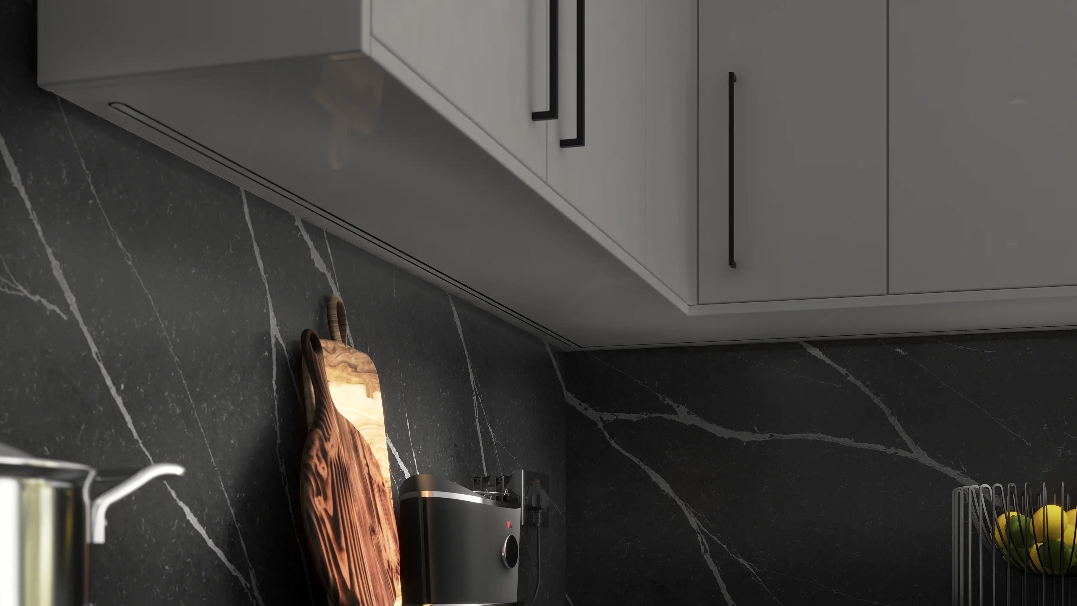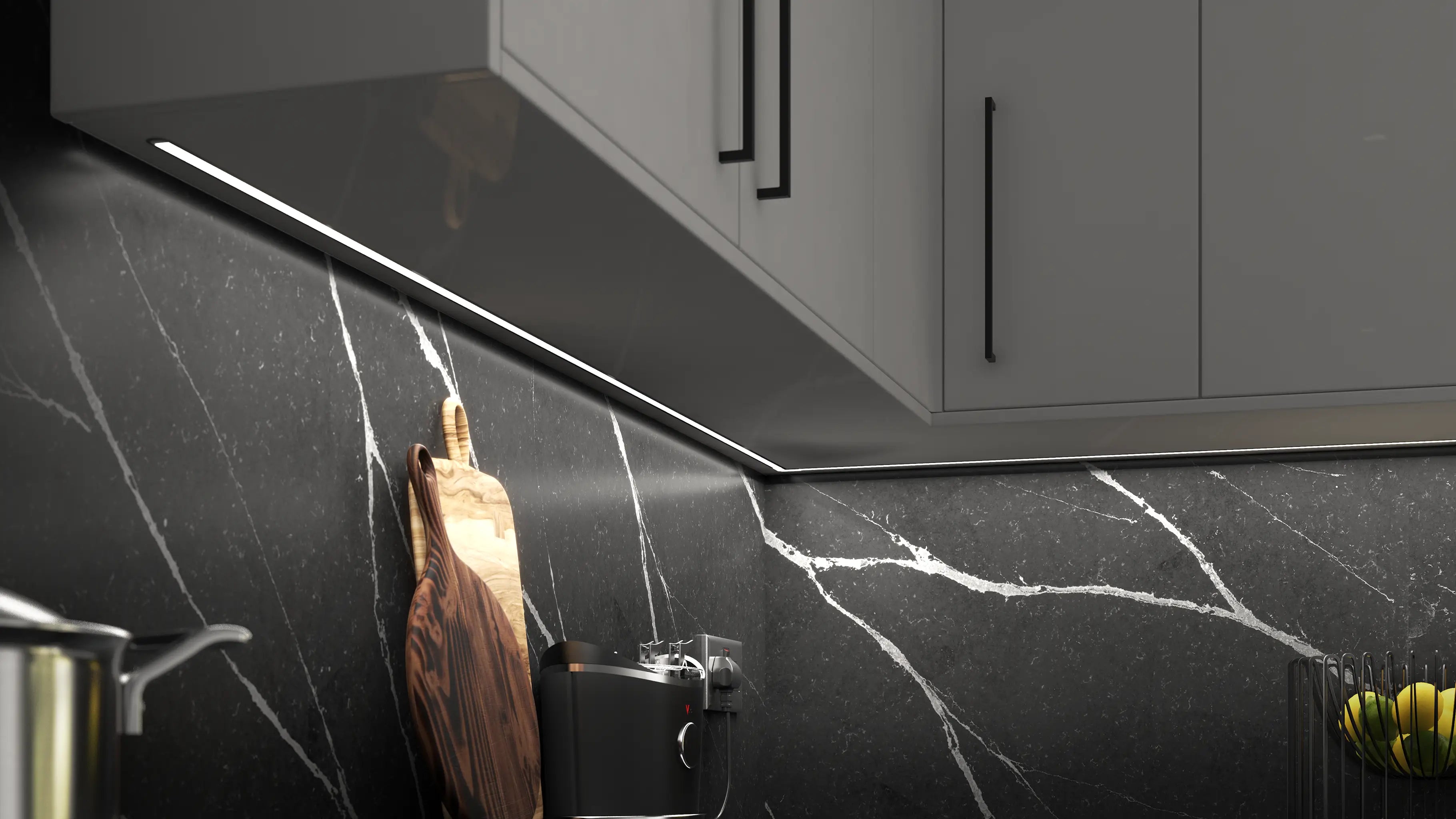 El Blaze se empotra al ras de la superficie para una estética integrada contemporánea. Una solución ideal para guiar un brillo uniforme por todo el espacio debajo de la encimera del mueble.