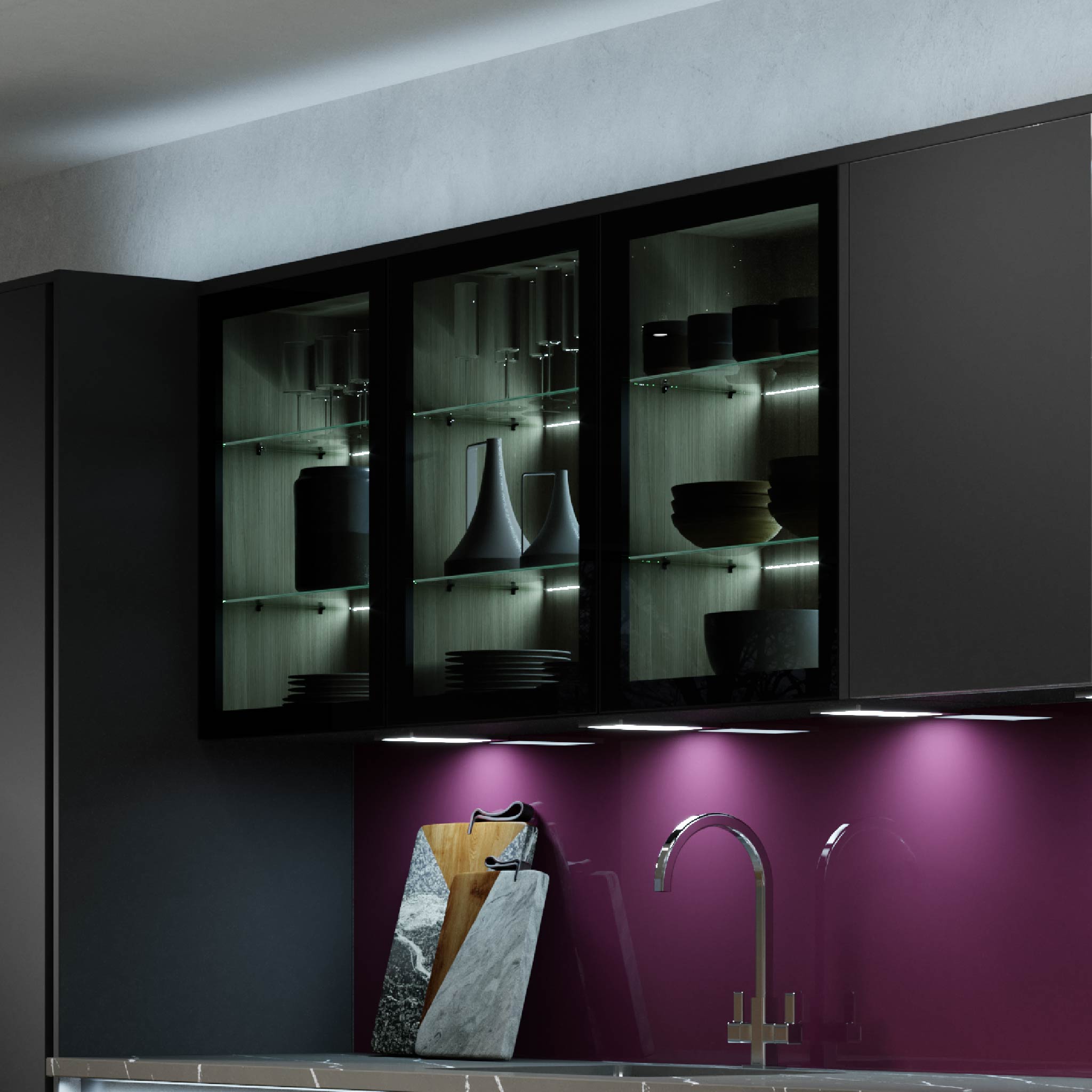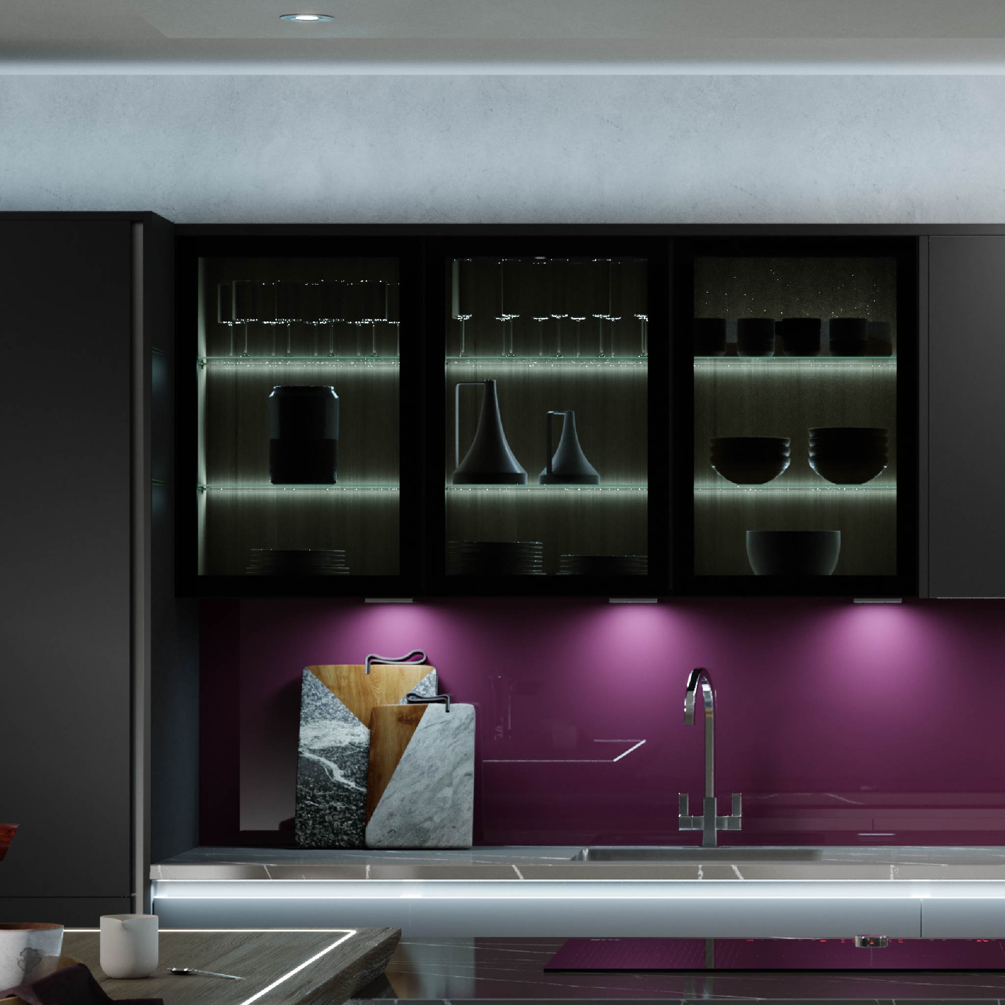 Glow emite una iluminación ambiental relajante que viaja a través de estantes de vidrio y fluye hacia la cocina.