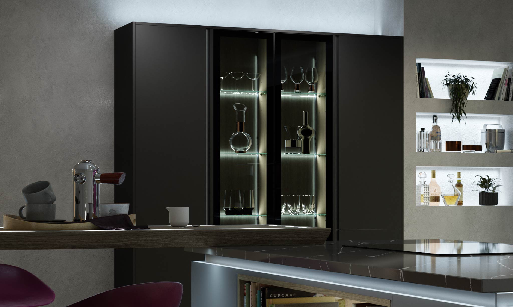 La iluminación de los estantes es discreta pero transformadora, ya que agrega énfasis a los elementos en los gabinetes destacados, además de brindar comodidad práctica al ubicar artículos en los armarios.