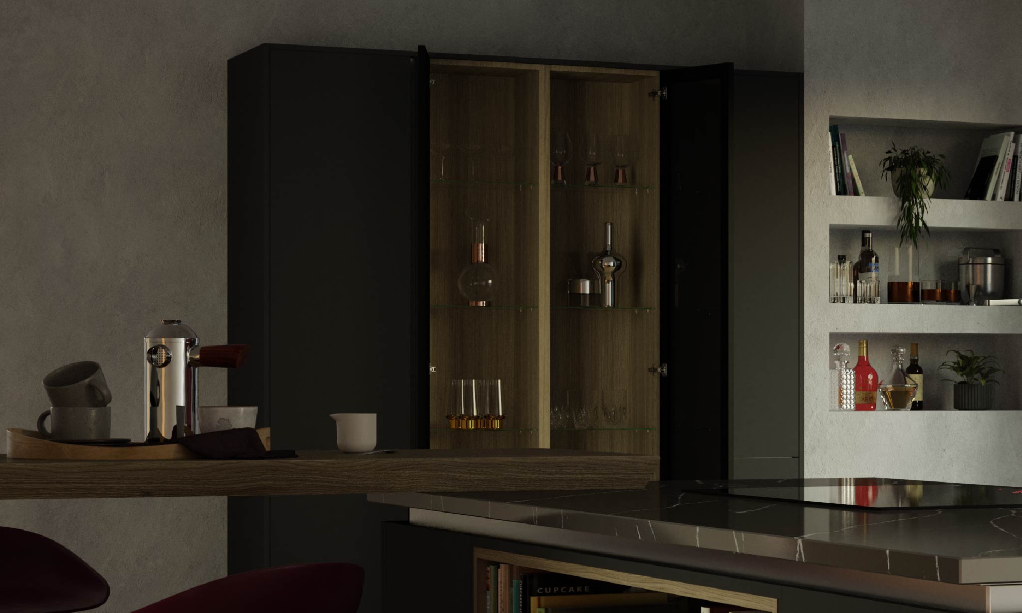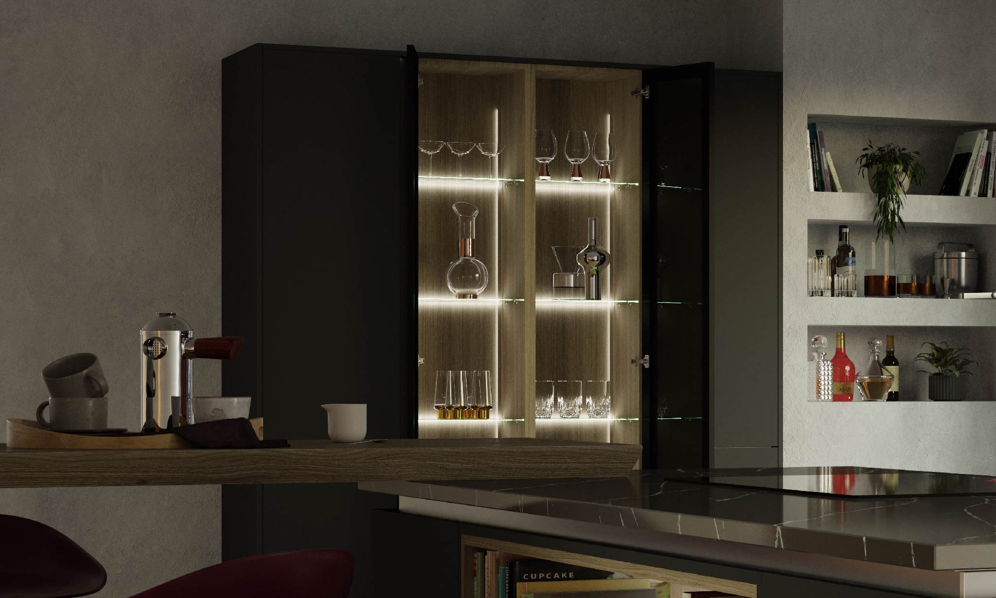 Glow Pro emite una iluminación ambiental relajante que viaja a través de estantes de vidrio y fluye hacia la cocina.