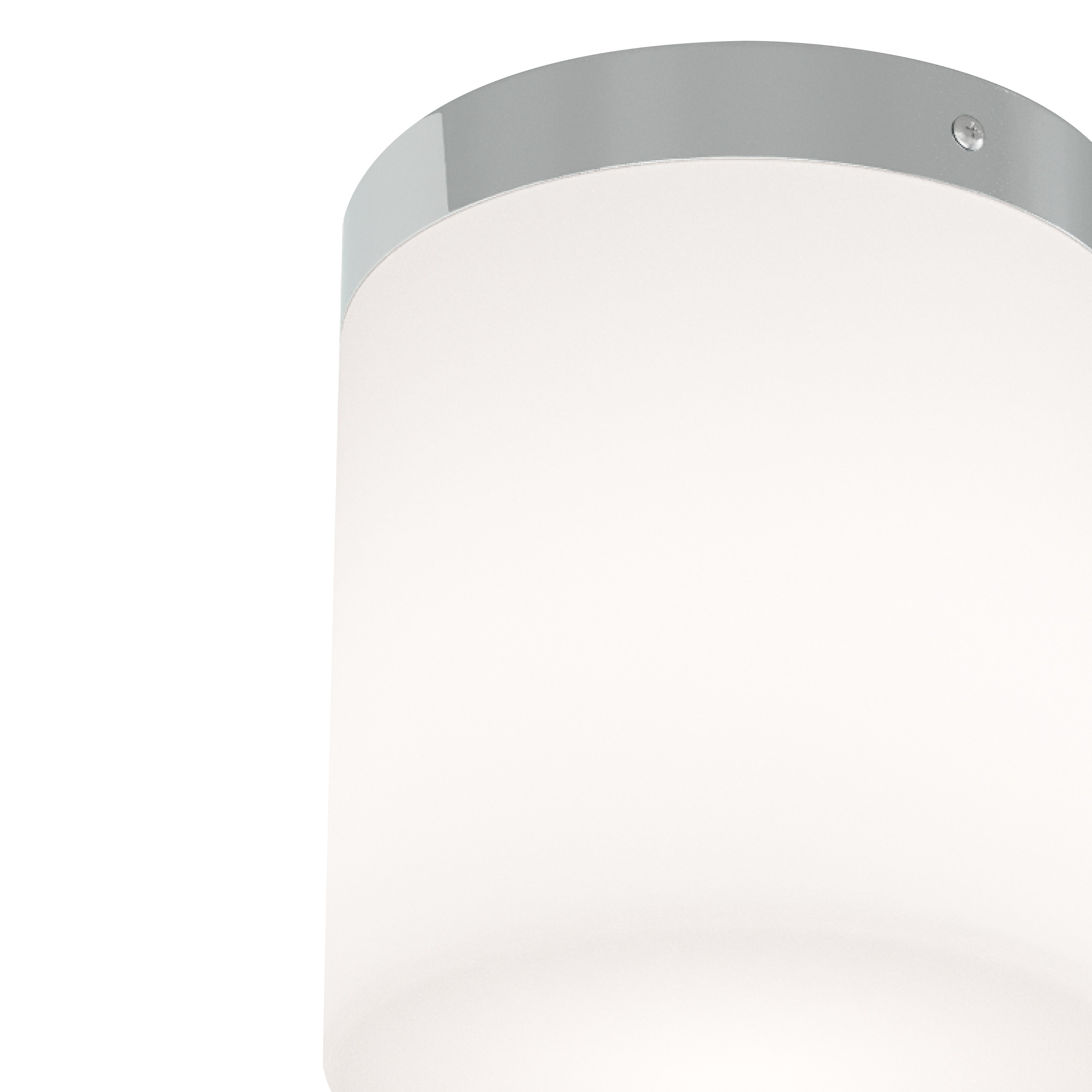 La luminaria empotrada en cromo se asienta perfectamente en la superficie del techo ocultando cualquier cableado eléctrico. La pantalla de vidrio esmerilado difuso suaviza el brillo de la luz en la habitación.