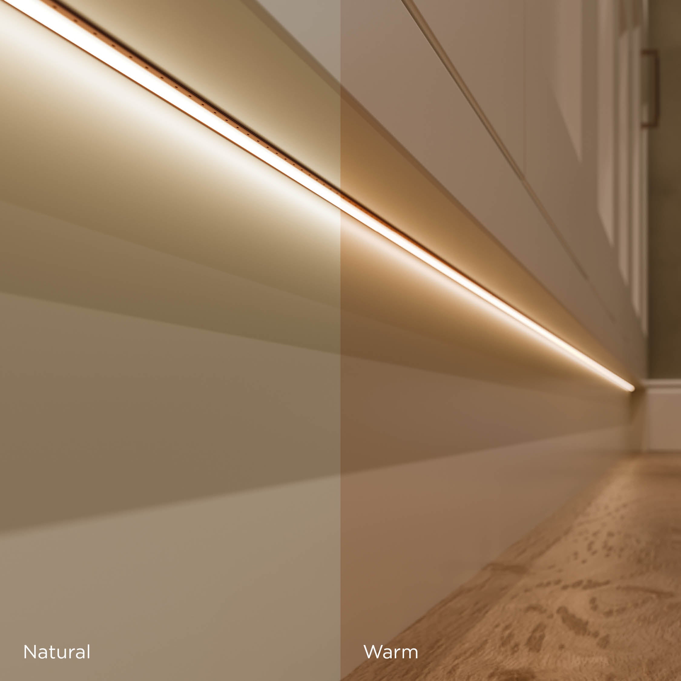 Al proporcionar una línea de luz completamente difusa sin puntos LED visibles, puedes crear un brillo ambiental suave sin necesidad de un perfil o una cubierta.